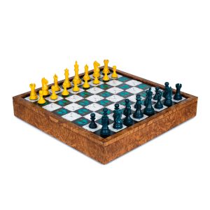 With the design originating in London, the games are made by artisans inside the UK and the distinctive style is a peerless set of perfection. Each design can be personable to the client with custom made hand etched dates, initials, or a private message. Every detail is embraced with craftmanship, right down to the semi-precious playing pieces.